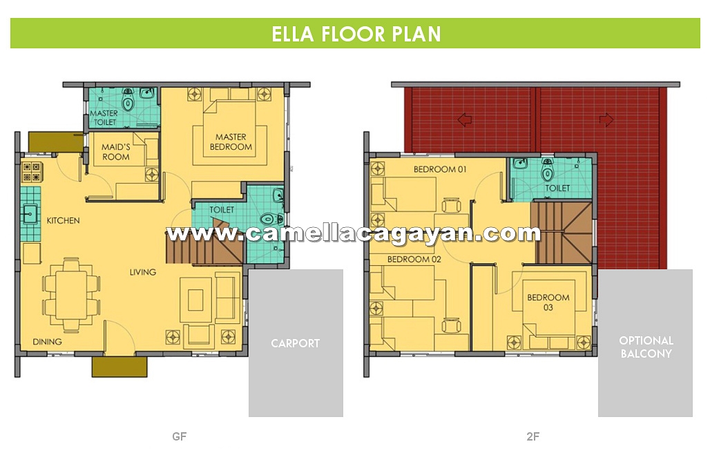 Ella has a lot area of 110 sqm and a house area of 100 sqm. It’s a single attached 2-storey house with five bedrooms, three toilets and baths, a living area, dining area, kitchen, a carport, provision for a balcony, and a laundry and service area. The grand master’s bedroom is located at the ground floor with exclusive toilet and bathroom. If you want the biggest space and all the extra rooms that you can have, Ella model is for you!